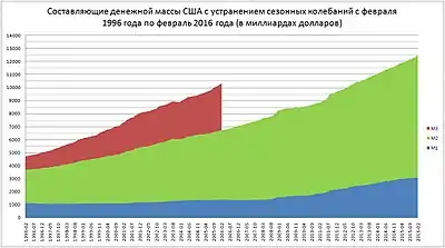 | M2 | M1 + большинство срочных вкладов, депозитные счета денежного рынка, а также депозитные сертификаты до 100,000 долларов. |