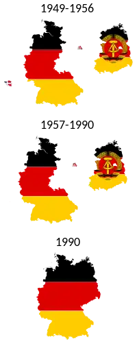 По причине оккупации Берлина и придания ему особого статуса столица государства была временно перенесена в провинциальный город Бонн. В том же году 7 октября в советской зоне оккупации была провозглашена Германская Демократическая Республика (ГДР) со столицей в Берлине (де-факто — лишь в находящейся под контролем ГДР восточной части города). В августе 1961 г. на заседании политбюро Социалистической единой партии Германии (СЕПГ — восточногерманская компартия) и в Совете министров ГДР было принято решение о закрытии границы с Западным Берлином и строительстве Берлинской Стены. В течение следующих сорока лет оба немецких государства существовали параллельно; при этом до начала 1970-х годов власти ФРГ категорически не признавали существования ГДР, а с 1970-х годов встали на путь её частичного признания. После падения Берлинской Стены 9 ноября 1989 года её территория была интегрирована в состав ФРГ в соответствии со статьёй 23 Конституции ФРГ (статья 23 гарантирует всем немецким землям безоговорочное право на вступление в сферу действия этого закона). Одновременно столица была возвращена в Берлин.
