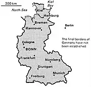 24 мая 1949 года заседавший в Бонне (британская зона) под контролем военных губернаторов Парламентский совет из 65 человек[2] провозгласил Федеративную Республику Германии в составе вновь созданных к тому моменту земель Нижняя Саксония, Северный Рейн-Вестфалия, Шлезвиг-Гольштейн и Гамбург (британская зона); Бавария, Бремен, Гессен и Вюртемберг-Баден (американская зона); Баден, Рейнланд-Пфальц и Вюртемберг-Гогенцоллерн (французская зона).