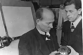 ![]() Инженер-технолог завода "Красный пролетарий" Н.С.Федин и начальник бюро изобретательства С.Д.Болхонский за обсуждением детали механизма. 1943 г. | |