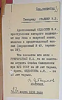 11 июля 1948 году Серов доложил Сталину, что дело Федосеева завершено, и он предлагает осудить его по 109 статье (злоупотребление служебным положением) УК РСФСР на 20 лет лагерей[12].