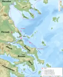 Согласно Геродоту, в проливе между островом Эвбея и материком, около мыса Артемисий, собрался 271 греческий корабль[53]. Во время этой битвы погодные условия для греков оказались крайне благоприятными. По пути к Артемисию персидский флот попал в сильный шторм, во время которого разбилось много кораблей. Когда эллины увидели огромный флот противника, то они устрашились и решили бежать[54]. Фемистокл выступил резко против этого предложения. Он сумел убедить эллинов обождать следующим образом. Жители острова Эвбея просили подождать с отплытием, так как им было необходимо переправить женщин и детей в безопасное место. Отплытие же греческого флота означало скорое разграбление острова персами. Фемистокл взял у них 30 талантов[54][55], из которых отдал Еврибиаду 5, а военачальнику коринфян Адиманту 3[56]. Плутарх упоминает также об 1 таланте, выданном триерарху одного из афинских судов, требовавшего немедленного отплытия[57]. Остальные деньги Фемистокл оставил себе[56].