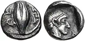 ![]() Гемиобол Фемистокла-младшего. Аверс — зерно ячменя, реверс — голова Аполлона | |
