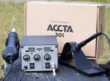 Как правило паяльные фены входят в комплект некоторых паяльных станций. Основные отличия от строительных фенов — меньший размер, корпус под другой тип хвата (без боковой ручки), более плавная и точная регулировка температуры и потока воздуха, набор насадок с тонкими соплами. Паяльные фены снабжаются подставками и автоматикой понижения температуры при нахождении на подставке.