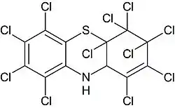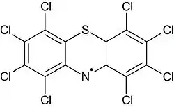 При нагревании до 180°С этот продукт ощепляет три атома хлора, при этом образуется устойчивый свободный радикал, который частично димеризуется, в результате чего образуется 10,10'-би-(октахлорфенотиазинил).