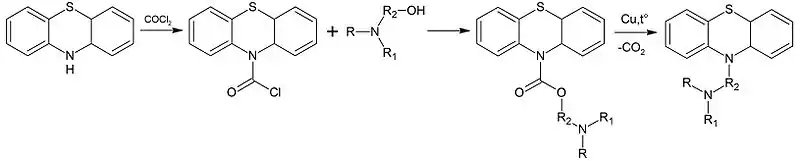 При взаимодействии фенотиазина с фосгеном образуется 10-хлоркарбонилфенотиазин, при реакции с аминоспиртами образующий сложные эфиры, которые при нагревании в вакууме с медью отщепляют углекислый газ, что позволяет вводить чувствительные к щелочам группы: