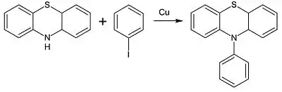 Фенотиазин вступает в реакцию Ульмана, при нагревании с металлической медью и иодбензолом в среде нитробензола, толуола или ДМФА[14] присоединение бензольного кольца происходит в положение 10 с образованием 10-фенилфенотиазина: