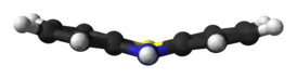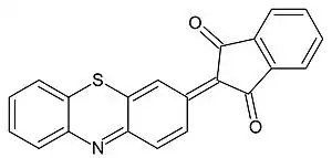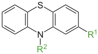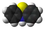 Фенотиази́н — гетероциклическое соединение, содержащее в цикле атомы серы и азота (другие названия — тиодифениламин, дибензотиазин, парадибензотиазин, 10H-дибензо-[b, e]-1,4-тиазин). Брутто-формула — С12Н9NS. Является сернистым аналогом феноксазина. Производные фенотиазина — лекарственные средства, обладающие холиноблокирующими (диэтазин), нейролептическим (аминазин[8]), антигистаминным (дипразин[9]) или антиаритмическим (этмозин[10]) действием, а также красители.