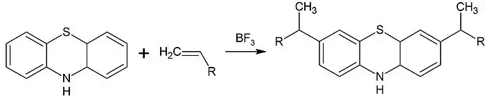 Фенотиазин сульфируется хлорсульфоновой кислотой. Алкилирование фенотиазина алкенами в присутствии трифторида бора приводит к 3,7 диалкилпроизводным: