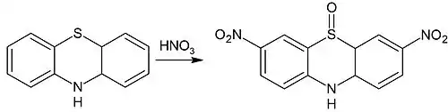 Электрофильное замещение в фенотиазине может также сопровождаться окислением. Так, конечным продуктом нитрования фенотиазина азотной кислотой является 3,7-динитрофенотиазиноксид-5:
