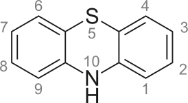 Согласно номенклатуре ИЮПАК, фенотиазины нумеруются против часовой стрелки, начиная с атома углерода, следующего за атомом азота[11]: