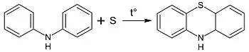 Фенотиазин может быть получен взаимодействием серы с дифениламином в присутствии катализатора — иода или хлорида алюминия. Для присоединения серы также могут использоваться дихлорид серы или тионилхлорид, но в этом случае происходит побочная реакция хлорирования. Реакция проходит при температуре 180—250°С. С помощью данной реакции можно получать также и производные фенотиазина, однако некоторые дифениламины, в особенности 2-замещённые, в неё не вступают, а 3-замещённые могут давать как 2-, так и 4-замещённые производные фенотиазина.[11]