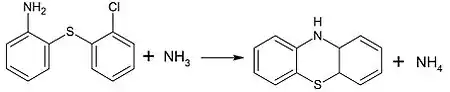 Обобщённым методом получения фенотиазина и его производных является превращение 2'-галоген- или -нитропроизводных 2-аминодифенилсульфида в присутствии сильных оснований (КNH2, жидкого аммиака) с образованием гетероцикла[13]: