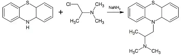 При взаимодействии фенотиазина с хлорзамещёнными третичными и вторичными аминами в присутствии амида натрия образуются 10-замещённые производные фенотиазина. Например, при алкилировании фенотиазина 2-диметиламино-1-хлорпропаном или 1-диметиламино-2-хлорпропаном образуется 10-(2-диметиламинопропил)фенотиазин (прометазин):