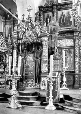 ![]() Икона в киоте Феодоровского монастыря. Фотография начала XX века | |