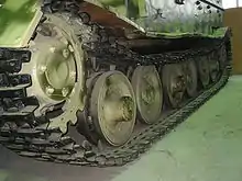 Ходовая часть САУ имела много общего с таковой экспериментального танка «Леопард», спроектированного Порше в 1940 году. Подвеска блокированная, комбинированная (торсион в сочетании с резиновой подушкой), торсионы размещены вне корпуса продольно на тележках. С каждого борта было расположено по три тележки с двумя опорными катками каждая. Такая подвеска, при некоторой сложности конструкции, отличалась надёжностью и хорошей ремонтопригодностью — так, замена катка занимала не более 3—4 часов. Конструкция катков была хорошо продумана и обеспечивала высокий срок службы при значительной экономии дефицитной резины. Заднее ведущее колесо имело съёмные зубчатые венцы с 19 зубьями каждый. Передние колеса — с активным зацеплением и оборудованы пневмо-гидравлическими тормозами.[16] Гусеничная цепь состояла из 108—110 литых стальных траков шириной 640 мм. В целом, конструкция ходовой части оказалась надёжной и удобной в эксплуатации[17].