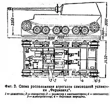 Силовая установка «Фердинанда» имела весьма оригинальную конструкцию — вращающий момент от двигателей к ведущим колёсам передавался электрически. Благодаря этому в машине отсутствовали такие узлы, как коробка перемены передач и главный фрикцион. Самоходка имела два V-образных 12-цилиндровых карбюраторных двигателя водяного охлаждения «Майбах» HL 120 TRM, установленных параллельно, мощностью по 265 л. с. (при 2600 об/мин). Выхлопные газы выводились в районе пятого опорного катка, что отрицательно сказывалось на ресурсе его резинового бандажа. Двигатели приводили в действие два электрогенератора Siemens-Schuckert Typ aGV напряжением 365 В. Тяговые электродвигатели Siemens-Schuckert D149aAC мощностью по 230 кВт были расположены в корме корпуса и приводили в действие каждый своё колесо через понижающий редуктор, выполненный по планетарной схеме. Тяговый двигатель благодаря этому — быстроходный и проблем с охлаждением не имел. Такая трансмиссия обеспечивала чрезвычайно лёгкое управление машиной, но отличалась значительным весом. Также электрооборудование САУ включало в себя вспомогательный электрогенератор, два стартера и четыре аккумуляторные батареи. В передней части «Фердинанда» располагались два топливных бака ёмкостью по 540 л.[15] Сброс охлаждающего электрические машины воздуха производился через короб у заднего «ленивца» ходовой части.
