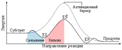 Второй путь ускорения химической реакции — добавление катализатора. Катализаторы ускоряют химические реакции, находя «обходные пути», позволяющие молекулам преодолевать активационный барьер на более низком энергетическом уровне. Катализатор (обозначим его буквой К) на промежуточной стадии взаимодействует с реагентом А с образованием нового комплексного соединения КА, переходному состоянию которого соответствует значительно более низкая энергия активации по сравнению с переходным состоянием реагента А в некатализируемой реакции. Затем комплекс реагент-катализатор (КА) распадается на продукт П и свободный катализатор, который может опять соединиться с другой молекулой А и повторить весь цикл. Именно таким образом катализаторы снижают энергию активации химической реакции, в их присутствии гораздо более значительная доля молекул данной популяции вступает в реакцию в единицу времени. Ферменты, так же как и другие катализаторы, соединяются со своими субстратами в ходе каталитического цикла[6].