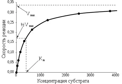 В 1972—1973 гг. была создана первая квантово-механическая модель ферментативного катализа (авторы М. В. Волькенштейн, Р. Р. Догонадзе, З. Д. Урушадзе и др.)[12][13][14][15]. Предположим, концентрация фермента постоянна и необходимо измерить влияние изменения концентрации субстрата на начальную скорость ферментативной реакции. При очень низких концентрациях субстрата скорость реакции очень мала, но стабильно возрастает по мере постепенного повышения концентрации субстрата. Однако приращения скорости каталитической реакции становятся с каждым возрастанием концентрации субстрата всё меньше и меньше. Наконец, наступает момент, когда любое увеличение концентрации субстрата вызывает лишь бесконечно малое ускорение реакции: как бы ни увеличивалась концентрация субстрата, скорость реакции может лишь приближаться к плато, но никогда его не достигнет. На этом плато, называемом максимальной скоростью реакции (Vmax) фермент насыщен субстратом и не может функционировать быстрее. Данный эффект насыщения свойственен почти всем ферментам.