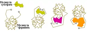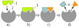 a) — Субстрат приближается к активному центру фермента; b) — субстрат и фермент образуют комплекс; c) — комплекс фермента и продуктов реакции; d) — продукты покидают активный центр фермента; 1 — субстрат; 2 — активный центр; 3 — активный центр немного изменяет форму для более точного соприкосновения с субстратом; 4 — продукты реакции, в примере на рисунке — расщепление молекулы субстрата, покидают активный центр.