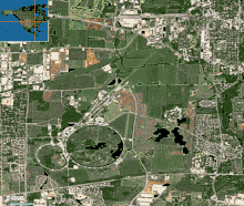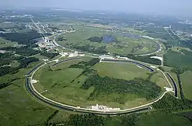 ![]() Вид на территорию Фермилаба с воздуха. Кольцо на переднем плане — Главный инжектор Теватрона, кольцо на заднем плане — Теватрон. Пруды вдоль колец отводят тепло от ускорителей. | |