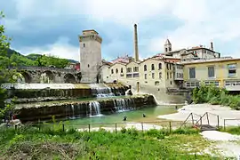 Средневековая башня и римский мост на реке Метауро, с рыбаками на водопаде