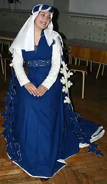 Девушка в реконструкции средневекового платья, украшенного фестонами