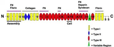 Фибронектин представлен в виде гомодимера, состоящего из 2 полипептидных субъединиц с молекулярной массой по 230–250 КДа, связанных друг с другом дисульфидными связями на С-концевой части молекулы. Каждая из субъединиц содержит три типа доменов, расположенных по длине субъединицы: домены I, II и III типов.