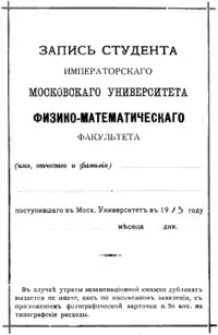 - Запись студента (экзаменационная книжка) Физико-математический факультет Императорского Московского Университета. 1913. 25 с.