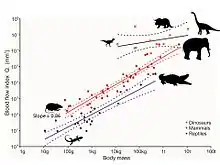 Эндотермы сильно зависят от аэробного метаболизма и имеют высокий уровень потребления кислорода во время активности и отдыха. Кислород, необходимый тканям, переносится кровью и, следовательно, скорость кровотока и кровяное давление у теплокровных эндотермов значительно выше, чем у холоднокровных эктотермов[94]. Минимальное кровяное давление у динозавров можно оценить измерением вертикального расстояния между сердцем и мозгом, потому что эта колонна крови должна иметь давление в нижней части, равное гидростатическому давлению, рассчитанному исходя из плотности крови и силы тяжести. К этому давлению добавляется то, которое требуется для перемещения крови через систему кровообращения. В 1976 году было указано, что из-за значительного расстояния от сердца до головы у многих динозавров минимальное давление крови уже было в диапазоне такового у эндотермов, и что у них обязательно должно было быть четырёхкамерное сердце, отделяющее поток высокого давления от потока с низким давлением[95].