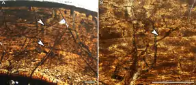 - длинные кишечники, которые, вероятно, содержали эндосимбиотические микроорганизмы, которые выделяли ферменты для переваривания целлюлозы: ни одно позвоночное не может переварить этот жёсткий материал своими собственными ферментами[14].