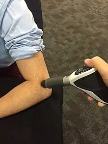 Применение ударно-волновой терапии при латеральной эпикондилалгии (теннисном локте) - звуком: ультразвуковая терапия, фонофорез, вибротерапия, ударно-волновая терапия, гравитационная терапия, тракционная терапия;