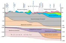 Территория, занимаемая Московской областью, находится в центральной части Восточно-Европейской платформы[2]; последняя, как и все платформы, складывается из кристаллического фундамента, в пределах Московской области не выходящего на поверхность, и осадочного чехла. В составе кристаллического фундамента — граниты и гнейсы архейского и протерозойского возраста, в составе осадочного чехла — отложения палеозойской, мезозойской и кайнозойской эр. Фундамент образует большую впадину — Московскую синеклизу — и залегает в её осевой зоне на 2—3 тыс. м.[3] Блоковый характер кристаллического фундамента определил структуру осадочного чехла: в рифейских прогибах, образованных на месте авлакогенов, горстам соответствуют седловины (выделяется Тумско-Шатурский выступ на востоке области, где глубина залегания фундамента составляет немногим более 1 км), а грабенам — впадины (Гжатская, Подмосковная, Пачелмская). Наименьшие глубины залегания кристаллического фундамента (1000 м) — к югу от города Серебряные Пруды (на крайнем юге области), наибольшие (4200 м) — к востоку от Сергиева Посада (на северо-востоке области)[4][5][6]. Начиная с протерозоя в пределах региона не было крупных тектонических подвижек; неотектонические движения носят волнообразный амплитудный характер; в северо-западных районах происходит поднятие на 1—8 мм в год, а восток области испытывает неотектонические опускания на 5—6 мм в год[7][8].