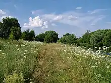 Южнее располагается зона широколиственных лесов, представленная преимущественно дубравами, разбросанными небольшими пятнами к югу от Оки. Встречаются также липовые леса. Основные древесные породы зоны, помимо дуба и липы, — клёны остролистный, татарский и полевой, ясень и два вида вяза. Для широколиственнх лесов характерен хорошо развитый подлесок, в котором участвуют лещина, бересклеты европейский и бородавчатый, жимолость, крушина ломкая, калина и другие кустарники. В широколиственных лесах встречаются яблоня лесная, груша обыкновенная, крушина слабительная и тёрн. Травяной покров разнообразен — здесь произрастают сныть, осока волосистая, папоротники, ветреница дубравная, гусиный лук, медуница, копытень, сочевичник весенний, ясменник пахучий, осока лесная, овсяница гигантская, бор развесистый, мятлик дубравный. В поймах рек встречаются черноольшанники, а также леса из дуба с примесью вяза; долине Оки к югу от Коломны — пойменные луга. Крайний юг области (Серебрянопрудский район и частично Серпуховский район) находятся в лесостепной зоне; все участки степи на водоразделах распаханы, они почти не сохранились. Небольшие участки остепнённых лугов и луговых степей охраняются здесь в нескольких заказниках на склонах реки Полосни, Осетра и др. В пределах лесостепной зоны изредка встречаются липовые и дубовые рощи[95][92].