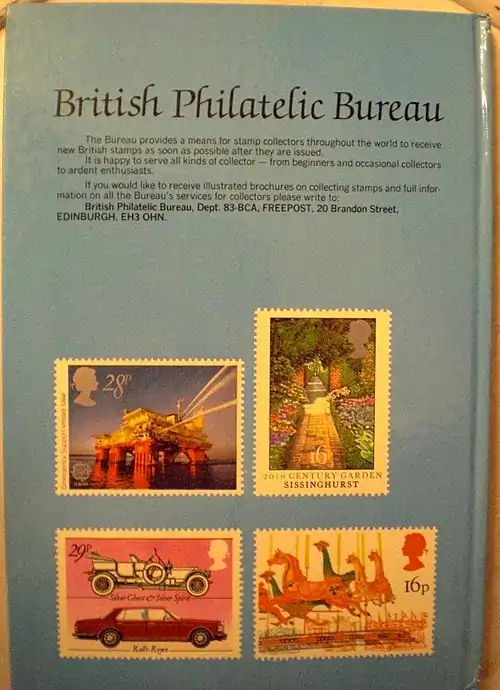«Бюро обеспечивает возможность коллекционерам марок по всему миру получать новые британские марки как можно скорее после их выпуска. Оно радо обслуживать все категории коллекционеров — от начинающих и случайных коллекционеров до пламенных энтузиастов. Если вы хотите получать иллюстрированные брошюры о коллекционировании марок и полную информацию обо всех услугах, которые Бюро оказывает коллекционерам, пожалуйста, напишите [указан адрес фирмы в Эдинбурге]».