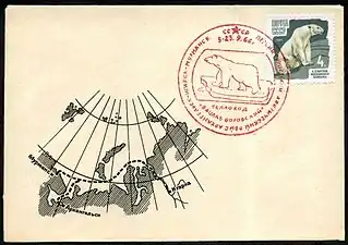 На каше показан маршрут 1-го туристического арктического рейса Архангельск — Игарка — Мурманск на теплоходе «Вацлав Воровский» 5—23 сентября 1966 года, о чём гласит памятный штемпель с изображением белого медведя, которым погашена марка с тем же зверем (ЦФА [АО «Марка»] № 3043)[^]