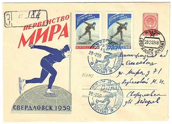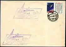 | Конверт, подготовленный коллекционерами Челябинска, с памятным каше[1] «Третий искусственный спутник Земли. Последний день на орбите. Г. Челябинск. 6.4.1960 г.» (слева)[^] и календарным штемпелем от 6 апреля 1960 года на марке СССР 1958 года с купоном (ЦФА [АО «Марка»] № 2176) |