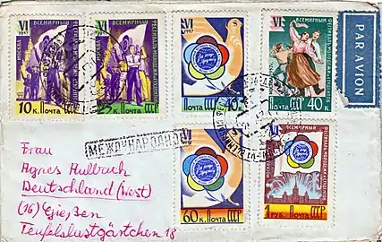 1957: оттиски трёх специальных почтовых штемпелей — выставки (в день открытия 29 июля и 8 августа) и встречи филателистов (2—3 августа), проходивших в дни VI Всемирного фестиваля молодёжи и студентов, одним из которых погашена марка СССР из фестивальной серии (ЦФА [АО «Марка»] № 2031). На конверте также проставлен штамп «Доплатить. 1 р»