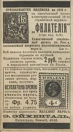 В 1896 году[2] в Киеве появился первый филателистический журнал России «Марки». С декабря 1913 года до конца 1917 года ежемесячно в Санкт-Петербурге—Петрограде издавался журнал «Филателия», последние номера которого вышли в первой половине 1918 года[2].