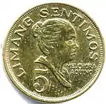 5 сентимо | 18,6 | 1,4 | 2,5 | латунь | 1967 1968 1970 1972 1974 | |