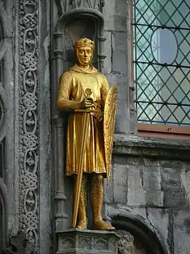 ![]() Золочёная сатуя Филиппа Эльзасского на фасаде базилики «Святой Крови» в Брюгге | |