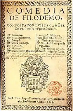 - Camões, Luis de. Auto de Filodemo // Primeira parte dos Autos e comedias portuguesas / nouamente juntas & emendadas por Afonso Lopez. — 1ª impressão. — [Lisboa]: Andres Lobato, 1587. — P. ff. 144–163. — 179 f p.