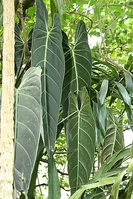 Листья у молодых растений мелкие, 8—10 см длиной, сердцевидной формы, с медно-красноватым оттенком; у взрослых крупные, 40—80 см длиной, продолговато-ланцетные, бронзово-зелёные, беловатые по жилкам, по краям с узкой светлой каймой, свисающие. Черешок 50 см длиной.