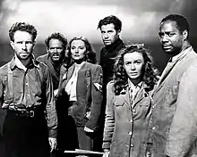 Кадр из фильма «Спасательная шлюпка» (1944). (Слева направо: Хьюм Кронин, Генри Халл, Таллула Бэнкхед, Джон Ходяк, Мэри Андерсон и Канада Ли
