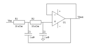 Реализуется в виде электронной схемы с двумя резисторами, двумя конденсаторами и активным элементом (например, с операционным усилителем), в совокупности образующих фильтр с передаточной функцией второго порядка. Фильтры более высокого порядка могут быть реализованы включением нескольких фильтров последовательно, причем для реализации фильтра с нечетным порядком в цепочку фильтров включают по крайней мере один фильтр 1-го порядка.