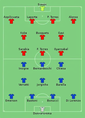 - Tactical Line-ups – Semi-finals – Italy v Spain (англ.). UEFA.com. Union of European Football Associations (6 October 2021).