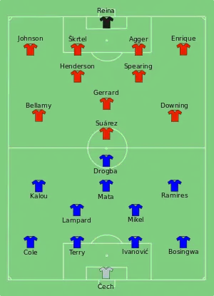 Первый удар по воротам произошел уже 40-й секунде матча Дидье Дрогба решился на дальний «выстрел» — мяч прошёл мимо ворот. Лондонцы начали активней, и в первые несколько минут мяч преимущественно находился на половине поля мерсисайдцев. Но скоро и эта активность сошла на, нет, и первые минуты матча прошли в неторопливом темпе. Обе команды заняли выжидательную позицию. За первые 10 минут команды нанесли всего один удар. Но на 11-й минуте матча Рамирес на правом фланге воспользовался позиционной ошибкой Хосе Энрике, легко убежал от него после передачи Хуана Маты, вошёл в штрафной и практически с угла вратарской отправил мяч в правый от себя нижний угол ворот Рейны — 1:0. Забитый мяч вынудил уже «Ливерпуль» добавить в активности, и почти сразу же «красные» могли счёт сравнять. Спустя минуту после пропущенного мяча Джонсон пошёл в атаку по своему правому флангу, прострелил на одиннадцатиметровую отметку, откуда слёту пробивал Беллами — Бранислав Иванович спас свою команду, успев вынести мяч из ворот. В ответной атаке уже защитник «Челси» пошёл в атаку. Босингва продольной передачей искал Дрогба, но неточно. Несколько отрезанными от своих партнёров по команде в первой половине тайма выглядели форварды «Ливерпуля». Особенно это касалось Луиса Суареса, который практически не касался мяча и кроме активного прессинга защитников ничем не запомнился. Первые 20 минут матча остались за «Челси». Большинство единоборств выигрывали именно футболисты в синем, ничего не позволяя впереди сделать мерсисайдцам. «Челси» тоже, по большому счёту, впереди ничего не создал опасного. Кроме гола, разумеется. Но атаки «синих» смотрелись опасней, и порой им не хватало последнего паса, чтобы вывести на убойную позицию Дрогба или Калу.