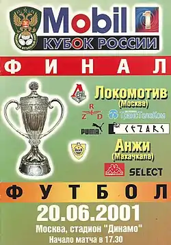 Финал Кубка России по футболу 2001 — 9-й финальный матч в истории розыгрышей Кубка России по футболу, который состоялся 20 июня 2001 года на московском стадионе «Динамо»[1]. В финале встречались московский «Локомотив», выигрывавший прежде три Кубка России, и махачкалинский «Анжи», прежде до этой стадии Кубка России не добиравшийся. Основное время матча завершилось со счётом 1:1, причём первый гол был забит на 90-й минуте, а второй — в компенсированное ко второму тайму время. В дополнительное время голов забито не было, а победу в послематчевых пенальти со счётом 4:3 одержал «Локомотив», выиграв свой четвёртый Кубок России за шесть лет[2].