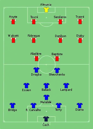 Основное время матча было продлено на пять минут после скандала, в результате которого капитан «Арсенала» Коло Туре, нападающий Эммануэль Адебайор и полузащитник «Челси» Джон Оби Микель были удалены с поля за агрессивное поведение, а Фрэнку Лэмпарду и Сеску Фабрегасу показны желтые карточки за неспортивное поведение.[1]