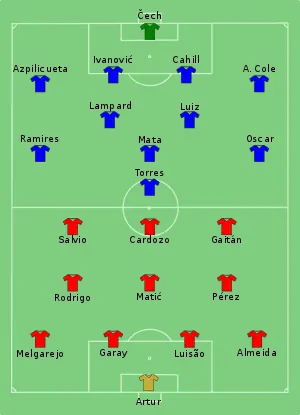 «Челси» по причине травм в финале не смогли помочь Эден Азар, капитан команды Джон Терри и Райан Бертранд, а также заигранный за «Ньюкасл Юнайтед» Демба Ба[30]. У «Бенфики» из-за перебора желтых карточек не сыграл Макси Перейра.